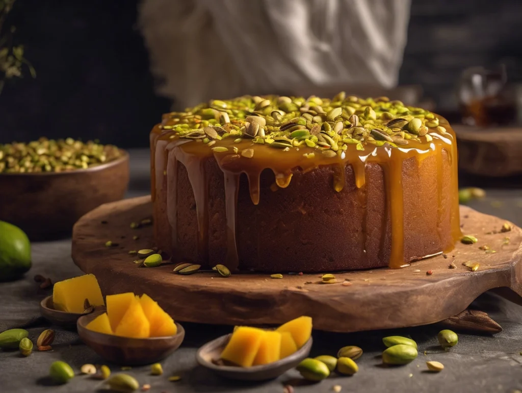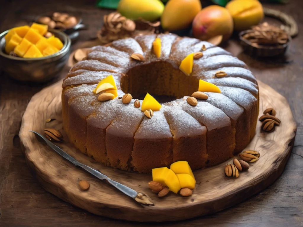 Pour the batter into a greased cake tin. Garnish with diced mango and sliced nuts for extra flavor and visual appeal.